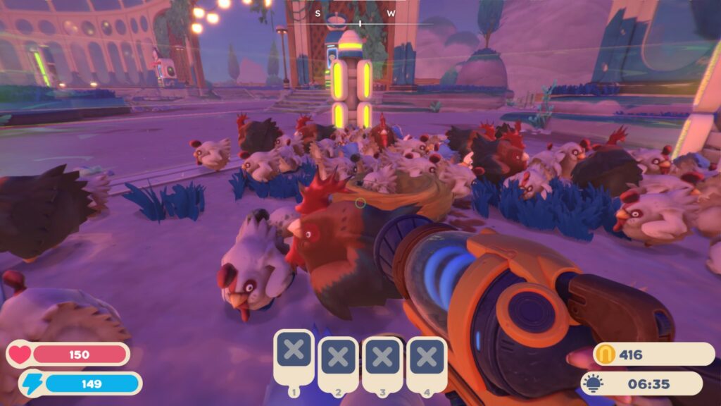 There are many different species of slimes. The first ones the player meets are usually cotton or pink slimes. These slimes are not dangerous and can be sucked into the player’s vac-pac to store or shoot them in any direction. The vac-pac inventory can store anything the player collects, but has a limited amount of space.